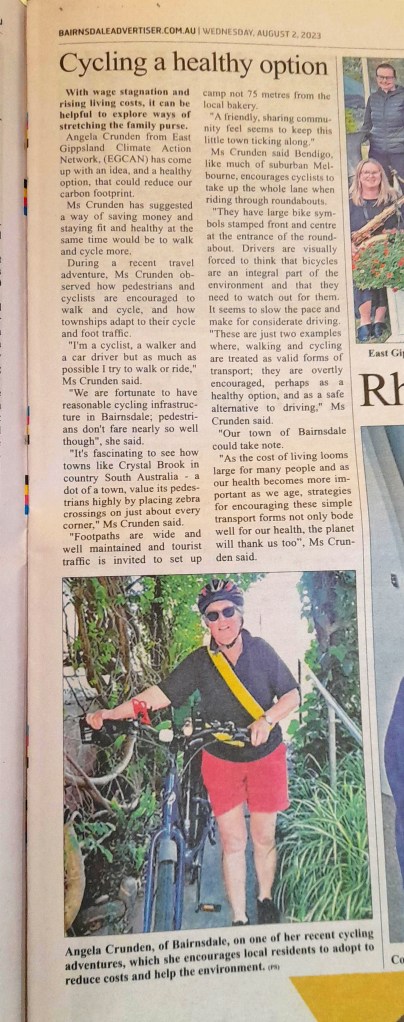 With wage stagnation and rising living costs, it can be helpful to explore ways of stretching the family purse. According to Angela Crunden of East Gippsland Climate Action Network, (EGCAN) a healthy option and one that reduces our carbon footprint is to walk and cycle more.
