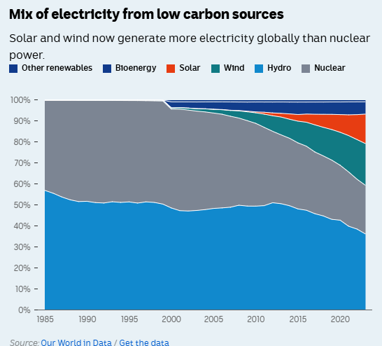 “If Chinese firms have any special sauce, that’s no use to us. I would say the Chinese model is essentially not relevant.” As you can see from the chart above, new nuclear energy is barely keeping pace with closures, and outside of China there is no evidence of a jump in the amount of nuclear energy coming online. In another sign of where the world is going, 2023 was the year when global large-scale battery investment overtook nuclear investment for the first time.