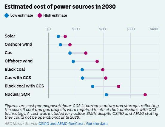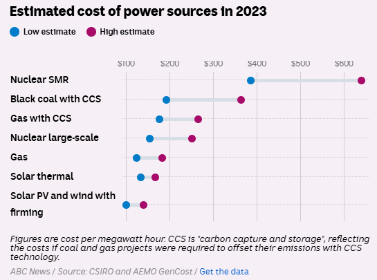 One of the reasons the Coalition is proposing nuclear is because of the cost of the clean energy transition, but when the CSIRO looked at the figures it found that nuclear was a significantly more expensive option. Building renewable energy on its own is a fraction of the cost of new nuclear, and in some cases lower than the cost of actually running nuclear power stations. However, a better comparison is between nuclear and solar or wind supported by storage and transmission.
