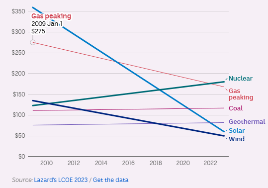 Global investment bank Lazard has been publishing an analysis of what’s called the levelized cost of energy (LCOE) since 2008. LCOE is essentially how much money a power source would have to sell its electricity for to make any money. In 2023, the lowest LCOE for nuclear power was $220/MWh, compared with onshore wind and batteries, which was $65MW/h, more than three times the cost. Even the top estimate of its range for solar and wind was still below nuclear’s cheapest range.