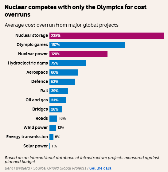 Nuclear isn’t alone in facing this cost, it’s applied to any technology a country hasn’t built before, and we only have to look at the NBN or Snowy 2.0 to see the likely outcome. But even in the world of big projects, nuclear power stations have among the worst track records for running over time and over cost. Mega project expert Bent Flyvbjerg has gathered a database of the costs and timeframes for major projects around the world. It shows nuclear power plants are among the worst for cost and timeframe overruns — on average they come in at more than double the original quoted price.