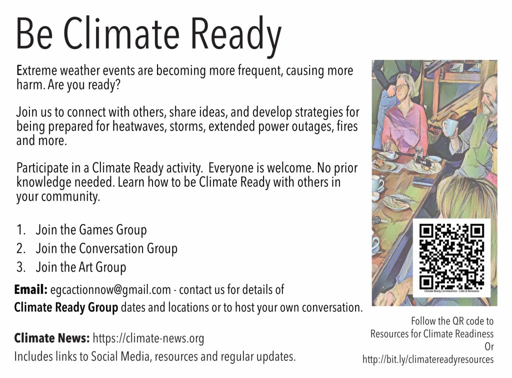 Are you prepared for the impacts of weather events, heatwaves, storms, or extended power outages? Meet and connect with others, share ideas, and develop practical strategies. We will explore topics related to preparing for future events: